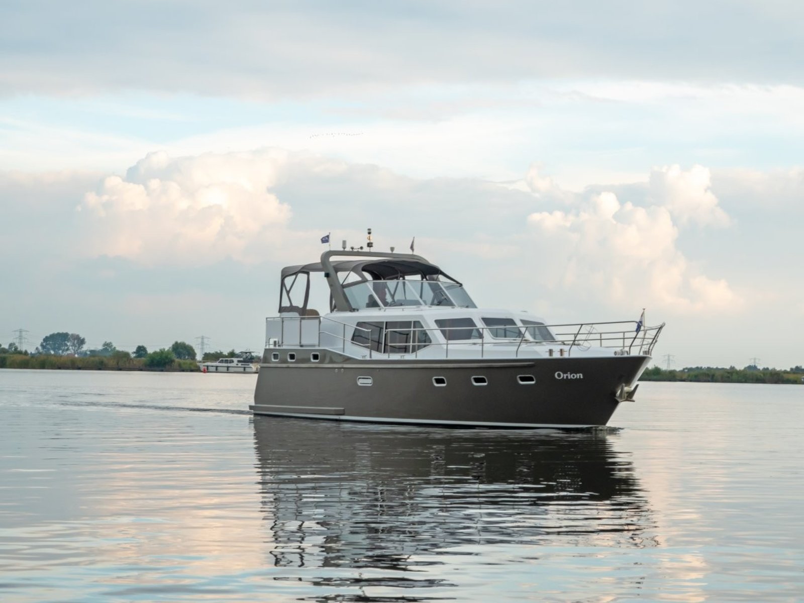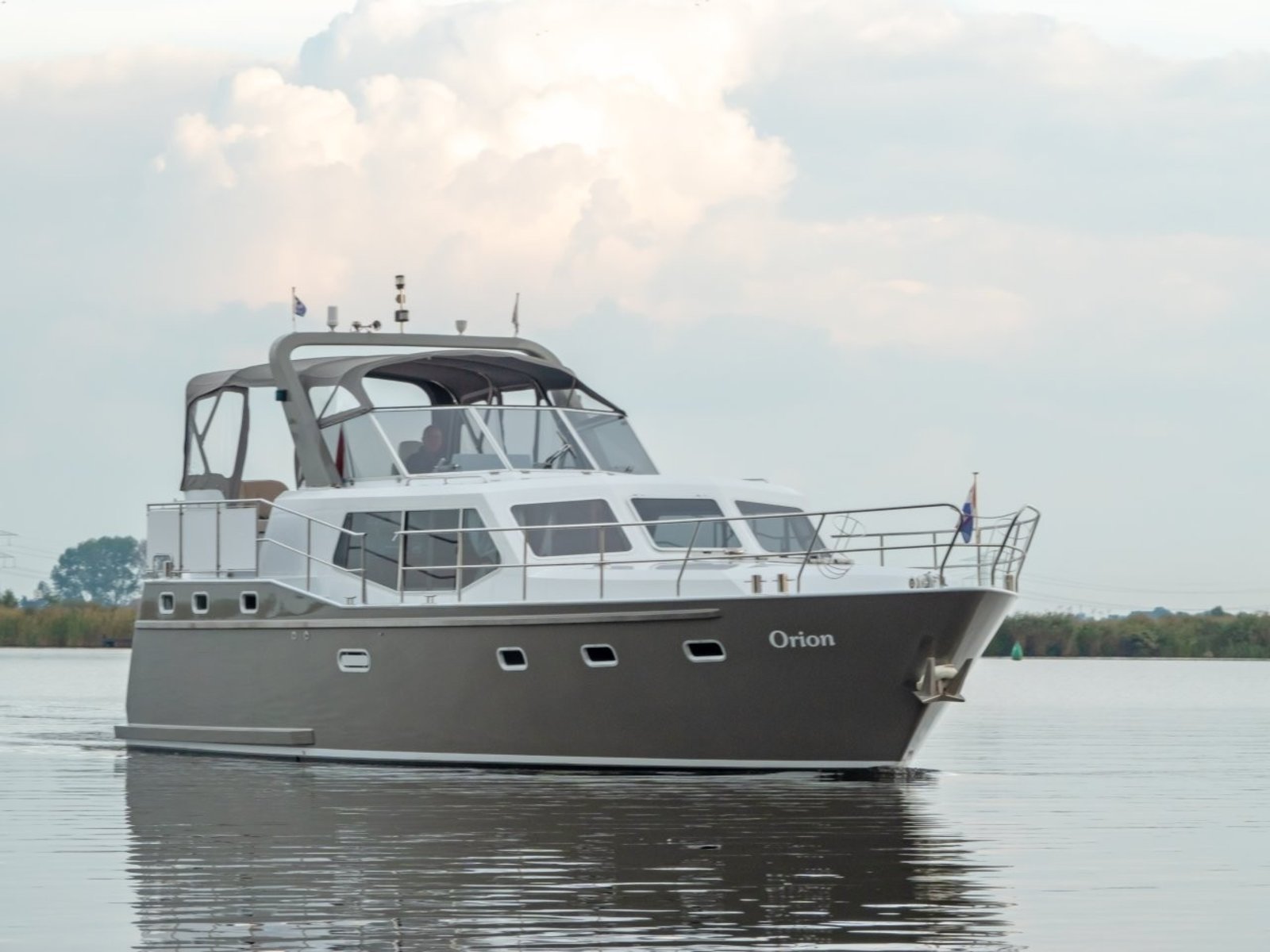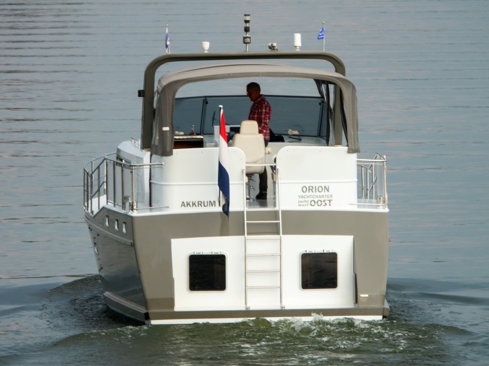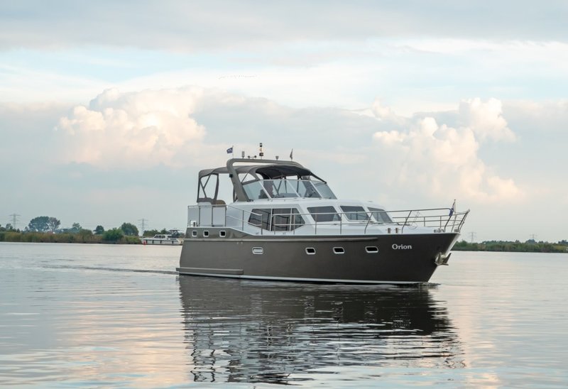 Nowee Novi 42 "Orion" is een schip met ruim achterdek en stuurstand, waar alle instrumenten zich in het zicht en binnen handbereik bevinden.