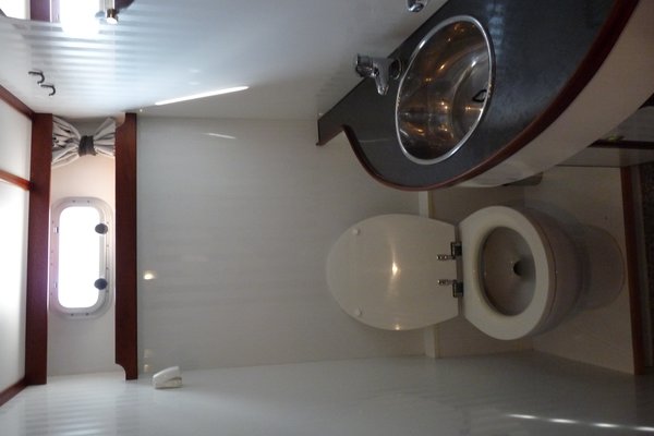 Het schip biedt 6 vaste slaapplaatsen in 3 hutten en twee toiletruimtes met douche.